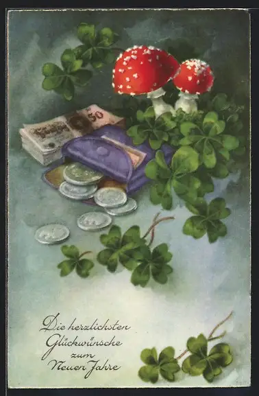 AK Portmonaie und Geldbündel an Fliegenpilz und vierblättrigen Kleeblättern