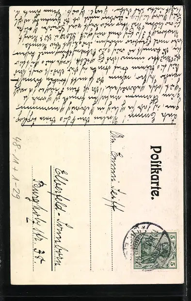 Personenbezogene Daten auf der Rückseite der Karte wurden durch blauen Textmarker unkenntlich gemacht. Die blauen Stellen sind auf die Vorderseite durchgeweicht und wirken sich negativ auf das Postkartenfoto aus