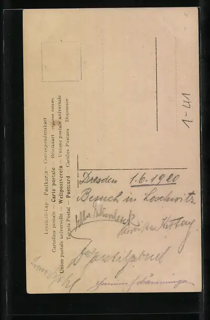 Personenbezogene Daten auf der Rückseite der Karte wurden durch blauen Textmarker unkenntlich gemacht. Die blauen Stellen sind auf die Vorderseite durchgeweicht und wirken sich negativ auf das Postkartenfoto aus