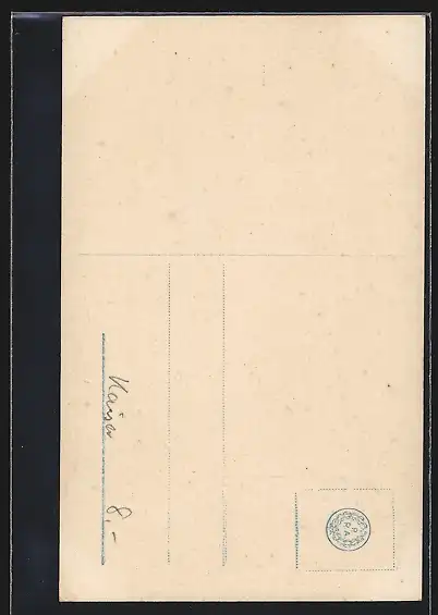 Personenbezogene Daten auf der Rückseite der Karte wurden durch blauen Textmarker unkenntlich gemacht. Die blauen Stellen sind auf die Vorderseite durchgeweicht und wirken sich negativ auf das Postkartenfoto aus