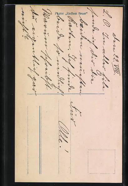 Personenbezogene Daten auf der Rückseite der Karte wurden durch blauen Textmarker unkenntlich gemacht. Die blauen Stellen sind auf die Vorderseite durchgeweicht und wirken sich negativ auf das Postkartenfoto aus