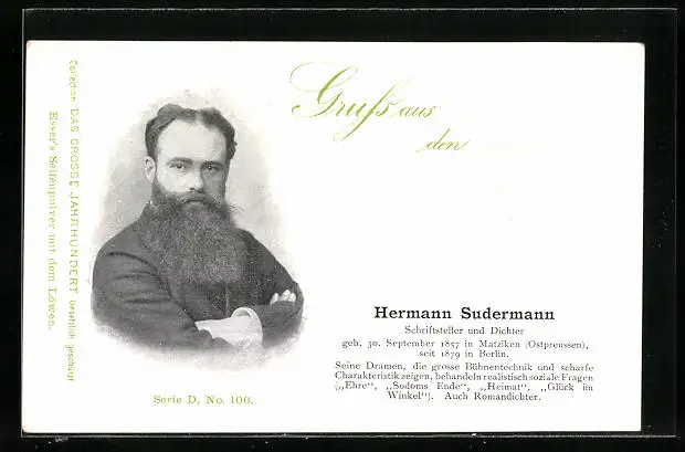 AK Portrait Schriftsteller Hermann Sudermann mit Vollbart im Anzug