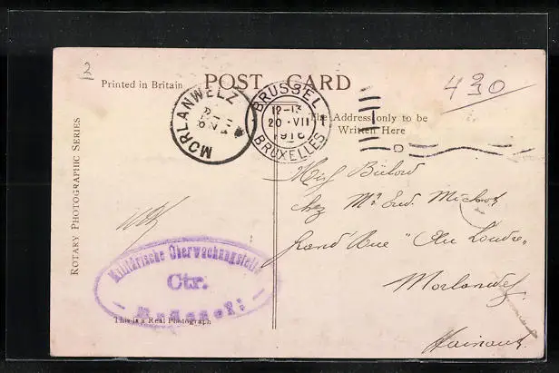 Personenbezogene Daten auf der Rückseite der Karte wurden durch blauen Textmarker unkenntlich gemacht. Die blauen Stellen sind auf die Vorderseite durchgeweicht und wirken sich negativ auf das Postkartenfoto aus