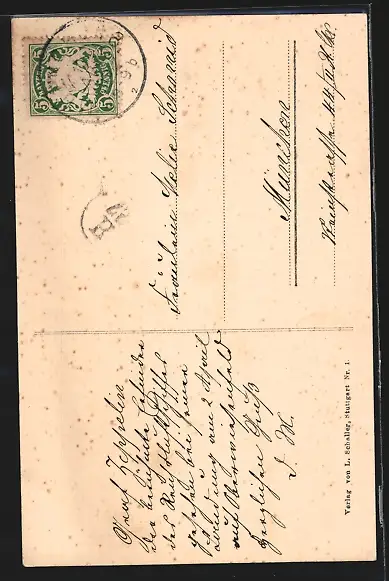 Personenbezogene Daten auf der Rückseite der Karte wurden durch blauen Textmarker unkenntlich gemacht. Die blauen Stellen sind auf die Vorderseite durchgeweicht und wirken sich negativ auf das Postkartenfoto aus