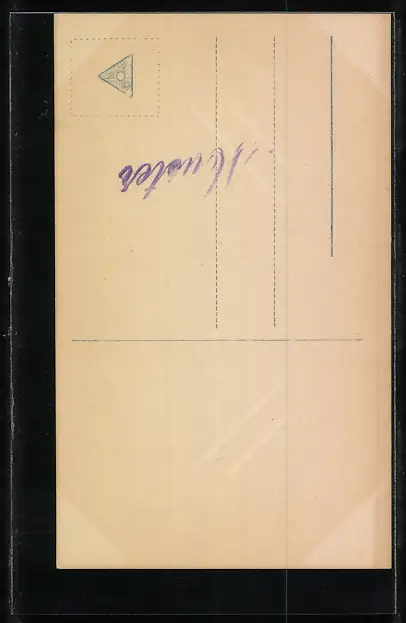 Personenbezogene Daten auf der Rückseite der Karte wurden durch blauen Textmarker unkenntlich gemacht. Die blauen Stellen sind auf die Vorderseite durchgeweicht und wirken sich negativ auf das Postkartenfoto aus