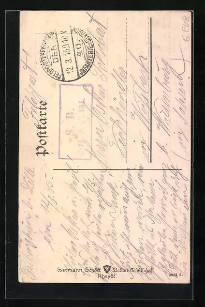 Personenbezogene Daten auf der Rückseite der Karte wurden durch blauen Textmarker unkenntlich gemacht. Die blauen Stellen sind auf die Vorderseite durchgeweicht und wirken sich negativ auf das Postkartenfoto aus