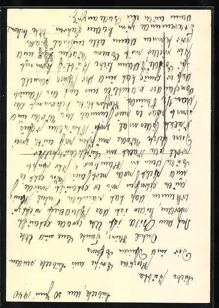 Personenbezogene Daten auf der Rückseite der Karte wurden durch blauen Textmarker unkenntlich gemacht. Die blauen Stellen sind auf die Vorderseite durchgeweicht und wirken sich negativ auf das Postkartenfoto aus