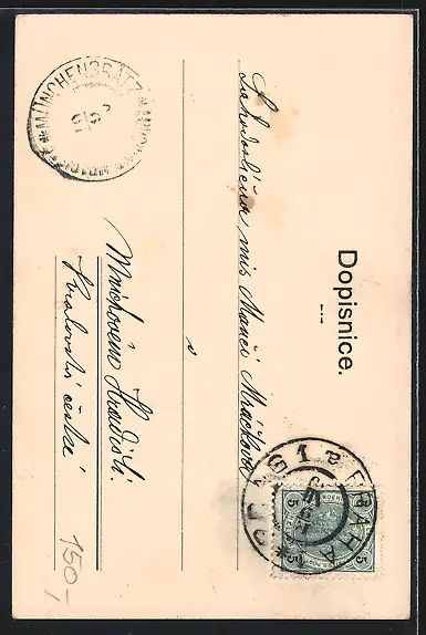 Personenbezogene Daten auf der Rückseite der Karte wurden durch blauen Textmarker unkenntlich gemacht. Die blauen Stellen sind auf die Vorderseite durchgeweicht und wirken sich negativ auf das Postkartenfoto aus