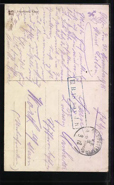 Personenbezogene Daten auf der Rückseite der Karte wurden durch blauen Textmarker unkenntlich gemacht. Die blauen Stellen sind auf die Vorderseite durchgeweicht und wirken sich negativ auf das Postkartenfoto aus