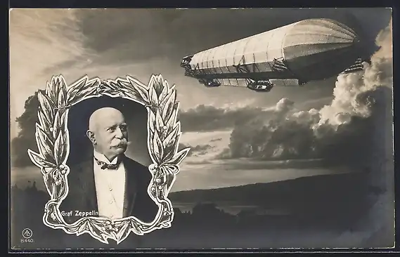 AK Portrait von Graf Zeppelin mit einem Luftschiff