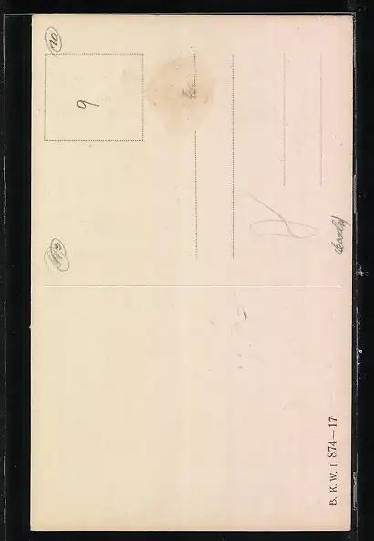 Personenbezogene Daten auf der Rückseite der Karte wurden durch blauen Textmarker unkenntlich gemacht. Die blauen Stellen sind auf die Vorderseite durchgeweicht und wirken sich negativ auf das Postkartenfoto aus