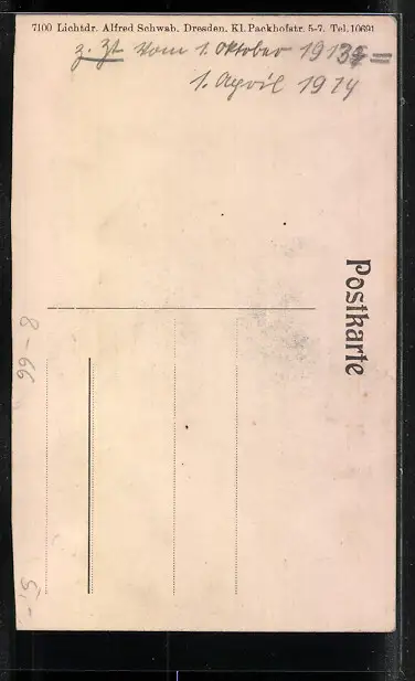 Personenbezogene Daten auf der Rückseite der Karte wurden durch blauen Textmarker unkenntlich gemacht. Die blauen Stellen sind auf die Vorderseite durchgeweicht und wirken sich negativ auf das Postkartenfoto aus
