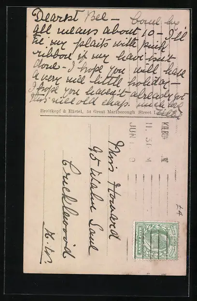 Personenbezogene Daten auf der Rückseite der Karte wurden durch blauen Textmarker unkenntlich gemacht. Die blauen Stellen sind auf die Vorderseite durchgeweicht und wirken sich negativ auf das Postkartenfoto aus