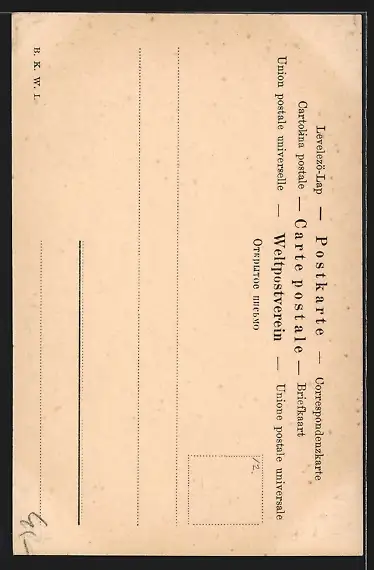 Personenbezogene Daten auf der Rückseite der Karte wurden durch blauen Textmarker unkenntlich gemacht. Die blauen Stellen sind auf die Vorderseite durchgeweicht und wirken sich negativ auf das Postkartenfoto aus