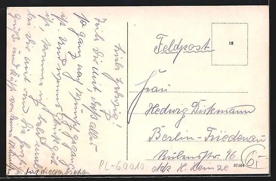 Personenbezogene Daten auf der Rückseite der Karte wurden durch blauen Textmarker unkenntlich gemacht. Die blauen Stellen sind auf die Vorderseite durchgeweicht und wirken sich negativ auf das Postkartenfoto aus
