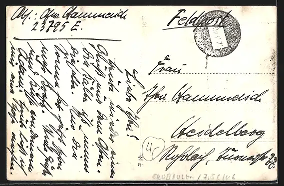 Personenbezogene Daten auf der Rückseite der Karte wurden durch blauen Textmarker unkenntlich gemacht. Die blauen Stellen sind auf die Vorderseite durchgeweicht und wirken sich negativ auf das Postkartenfoto aus