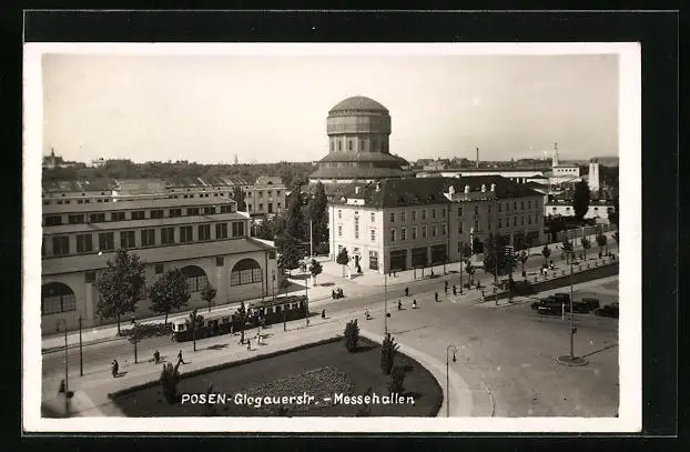 AK Posen, Glogauerstrasse mit Messehallen und Strassenbahn