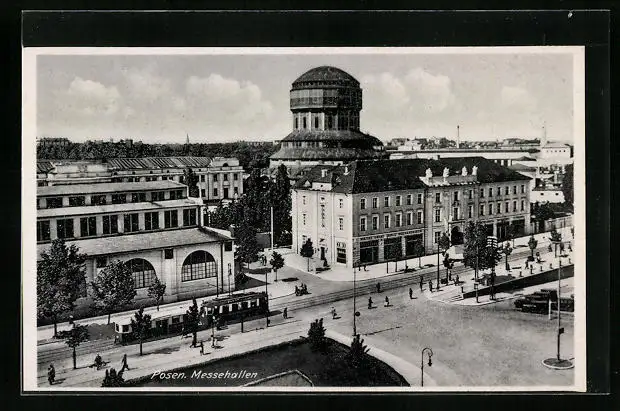 AK Posen, Partie an den Messehallen mit Strassenbahn