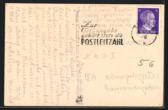 Personenbezogene Daten auf der Rückseite der Karte wurden durch blauen Textmarker unkenntlich gemacht. Die blauen Stellen sind auf die Vorderseite durchgeweicht und wirken sich negativ auf das Postkartenfoto aus