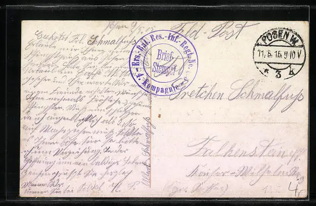 alte Ansichtskarte, gelaufen 1915 als Feldpost, Eckknicke li. unten u. re. oben, Stempelspur, guter Zustand