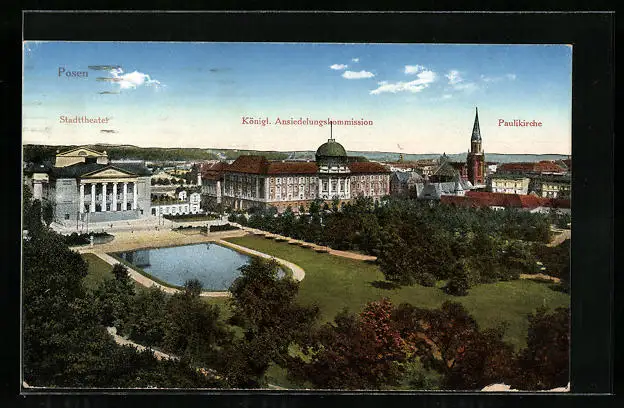 AK Posen, Teilansicht mit Stadttheater, Ansiedelungskommission und Paulikirche