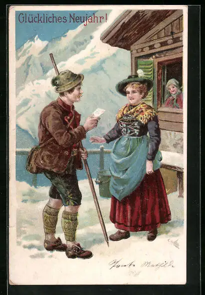 AK Postbote mit Brief für Frau, Neujahrsgruss