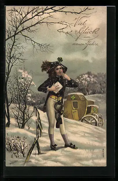 AK Postbote mit Briefen und Postkutsche steht im Schnee, Goldverzierung