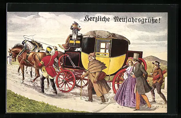 AK Postkutsche mit Bergvorgespann, Neujahrsgruss 1848