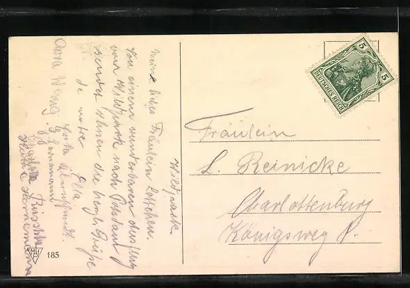 Personenbezogene Daten auf der Rückseite der Karte wurden durch blauen Textmarker unkenntlich gemacht. Die blauen Stellen sind auf die Vorderseite durchgeweicht und wirken sich negativ auf das Postkartenfoto aus