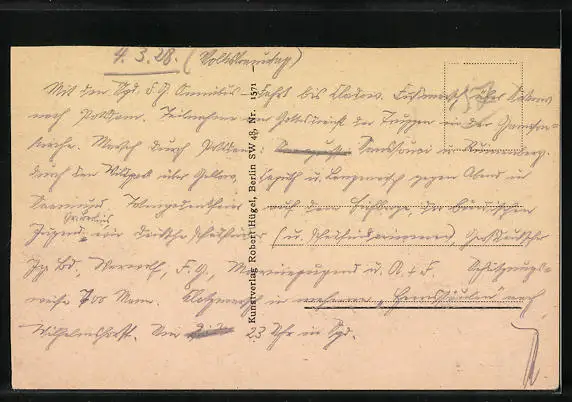 Personenbezogene Daten auf der Rückseite der Karte wurden durch blauen Textmarker unkenntlich gemacht. Die blauen Stellen sind auf die Vorderseite durchgeweicht und wirken sich negativ auf das Postkartenfoto aus