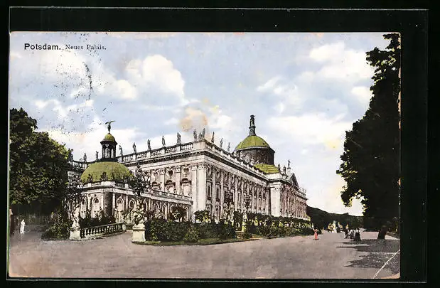 Personenbezogene Daten auf der Rückseite der Karte wurden durch blauen Textmarker unkenntlich gemacht. Die blauen Stellen sind auf die Vorderseite durchgeweicht und wirken sich negativ auf das Postkartenfoto aus