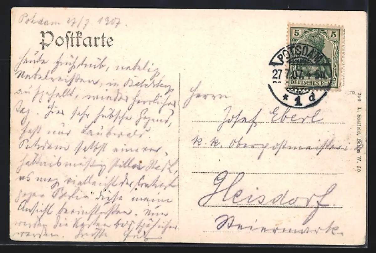 alte Ansichtskarte, gelaufen 1907, Eckknick unten re., Stempelspur, guter Zustand