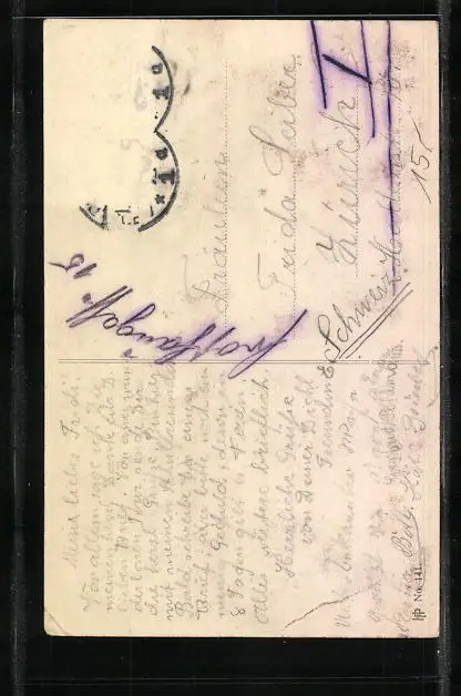 Personenbezogene Daten auf der Rückseite der Karte wurden durch blauen Textmarker unkenntlich gemacht. Die blauen Stellen sind auf die Vorderseite durchgeweicht und wirken sich negativ auf das Postkartenfoto aus