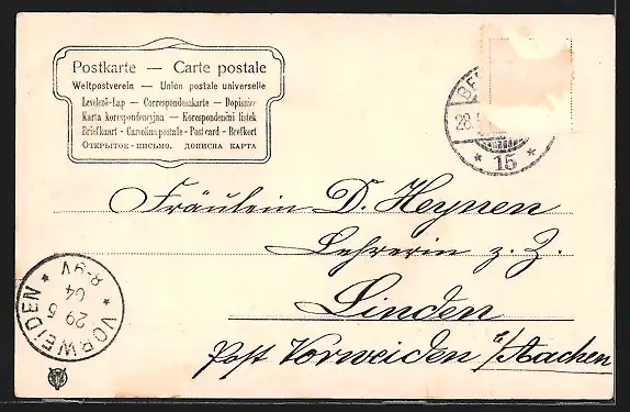 alte Ansichtskarte, gelaufen 1904, Briefmarke entfernt, rückseitig Oberflächenschaden, guter Zustand