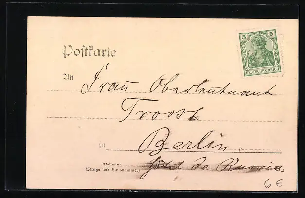 Personenbezogene Daten auf der Rückseite der Karte wurden durch blauen Textmarker unkenntlich gemacht. Die blauen Stellen sind auf die Vorderseite durchgeweicht und wirken sich negativ auf das Postkartenfoto aus