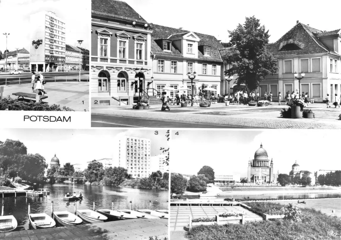 Ansichtskarte Potsdam vier Abb. - Friedrich-Ebert-Str., Klement-Gottwald-Str., Bootsverleih Freundschaftsinsel, Blick zur Nikolaikirche Erhaltung I-II postalisch gelaufen, gestempelt: Caputh, 23.7.85 Druckvermerk: 1982 Herstellungsland: DDR Verlag: Bild und Heimat, Reichenbach i. V. - 01 04 32 278