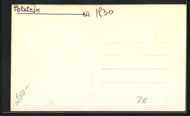 Personenbezogene Daten auf der Rückseite der Karte wurden durch blauen Textmarker unkenntlich gemacht. Die blauen Stellen sind auf die Vorderseite durchgeweicht und wirken sich negativ auf das Postkartenfoto aus