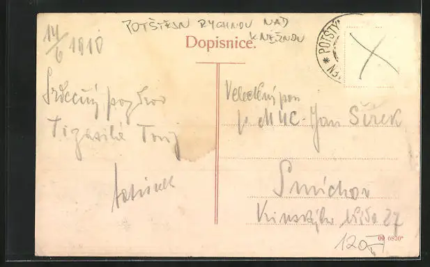 gelaufen 1910, Briefmarke entfernt, rückseitig Oberflächenschaden, guter Zustand