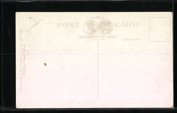 Personenbezogene Daten auf der Rückseite der Karte wurden durch blauen Textmarker unkenntlich gemacht. Die blauen Stellen sind auf die Vorderseite durchgeweicht und wirken sich negativ auf das Postkartenfoto aus