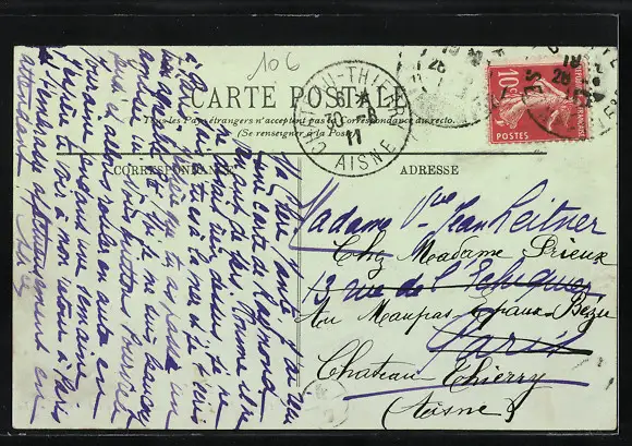Personenbezogene Daten auf der Rückseite der Karte wurden durch blauen Textmarker unkenntlich gemacht. Die blauen Stellen sind auf die Vorderseite durchgeweicht und wirken sich negativ auf das Postkartenfoto aus