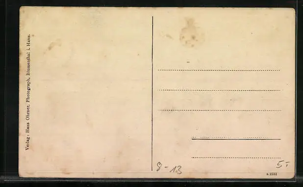 Personenbezogene Daten auf der Rückseite der Karte wurden durch blauen Textmarker unkenntlich gemacht. Die blauen Stellen sind auf die Vorderseite durchgeweicht und wirken sich negativ auf das Postkartenfoto aus