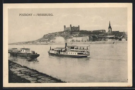 AK Pozsony, Dampfer auf der Donau, Blick zur Festung
