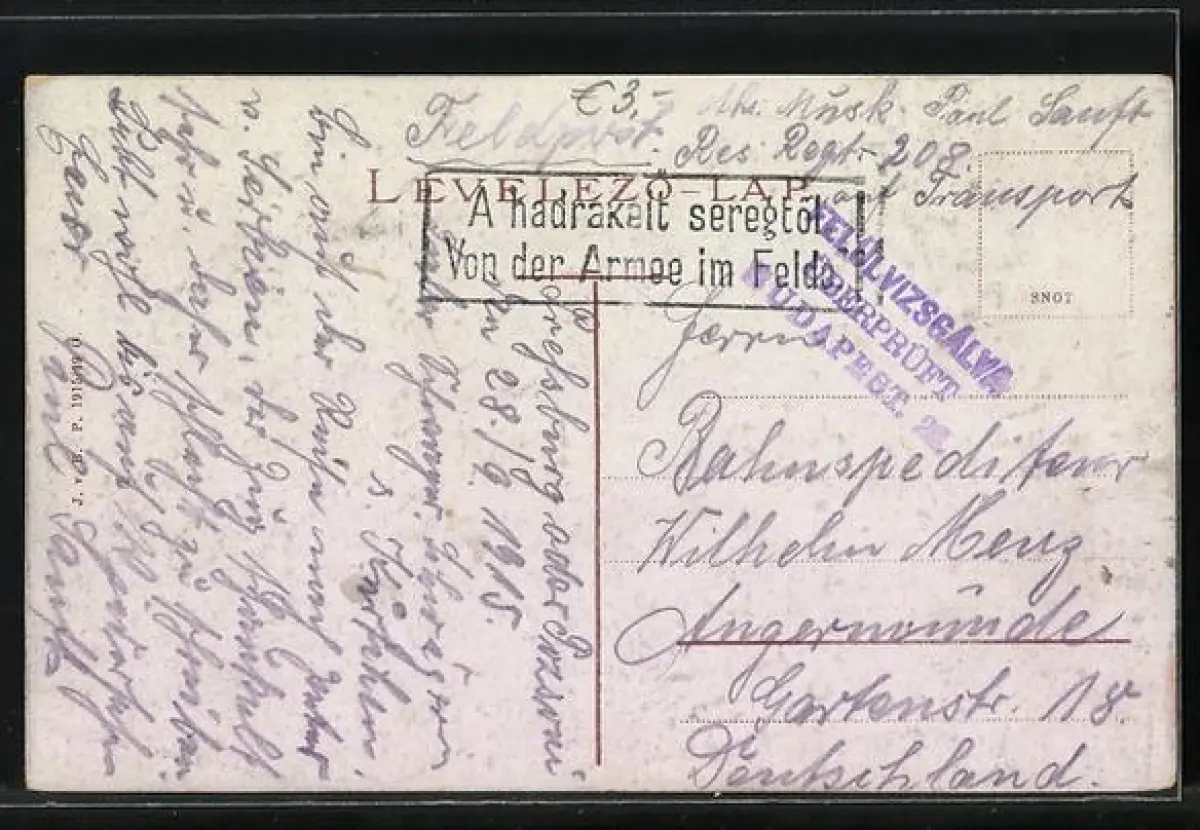 Personenbezogene Daten auf der Rückseite der Karte wurden durch blauen Textmarker unkenntlich gemacht. Die blauen Stellen sind auf die Vorderseite durchgeweicht und wirken sich negativ auf das Postkartenfoto aus