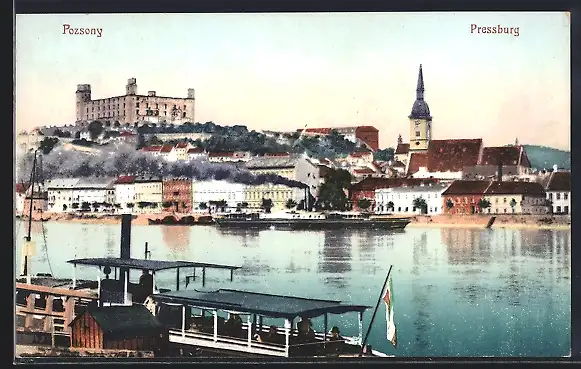 AK Pozsony-Pressburg, Donaupartie mit Dampfer
