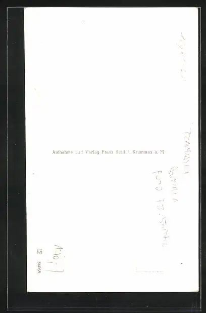 Personenbezogene Daten auf der Rückseite der Karte wurden durch blauen Textmarker unkenntlich gemacht. Die blauen Stellen sind auf die Vorderseite durchgeweicht und wirken sich negativ auf das Postkartenfoto aus