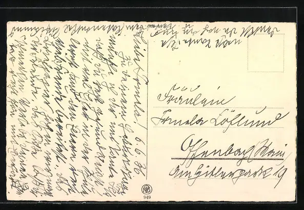 Personenbezogene Daten auf der Rückseite der Karte wurden durch blauen Textmarker unkenntlich gemacht. Die blauen Stellen sind auf die Vorderseite durchgeweicht und wirken sich negativ auf das Postkartenfoto aus