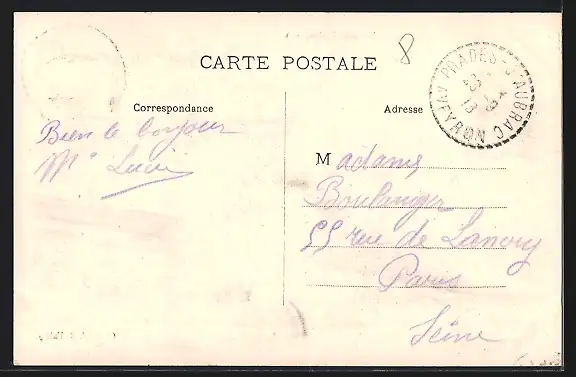 Personenbezogene Daten auf der Rückseite der Karte wurden durch blauen Textmarker unkenntlich gemacht. Die blauen Stellen sind auf die Vorderseite durchgeweicht und wirken sich negativ auf das Postkartenfoto aus