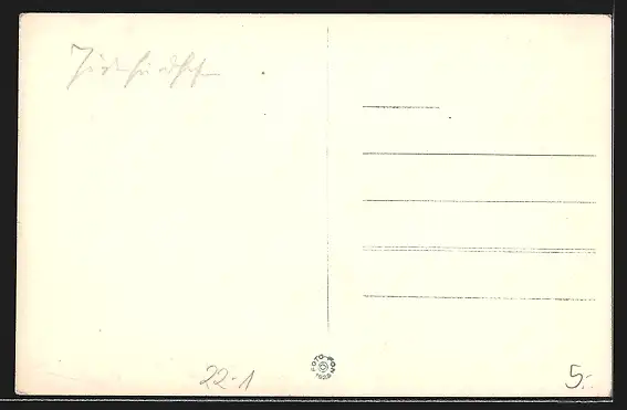 Personenbezogene Daten auf der Rückseite der Karte wurden durch blauen Textmarker unkenntlich gemacht. Die blauen Stellen sind auf die Vorderseite durchgeweicht und wirken sich negativ auf das Postkartenfoto aus