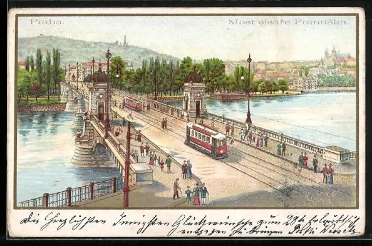 AK Prag, Kaiser Franzens-Brücke mit Strassenbahn