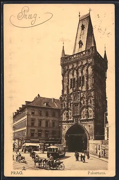 AK Prag, Pulverturm mit Strassenbahn und Kutsche